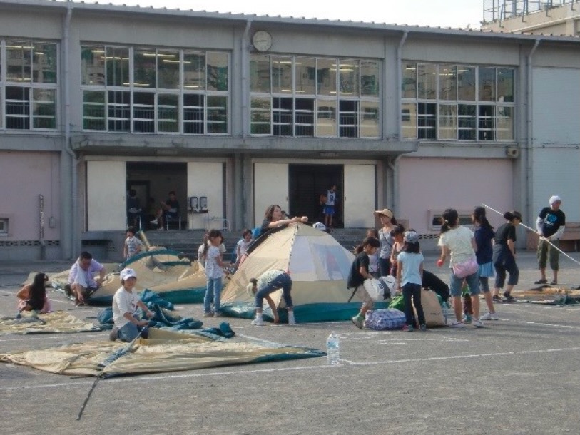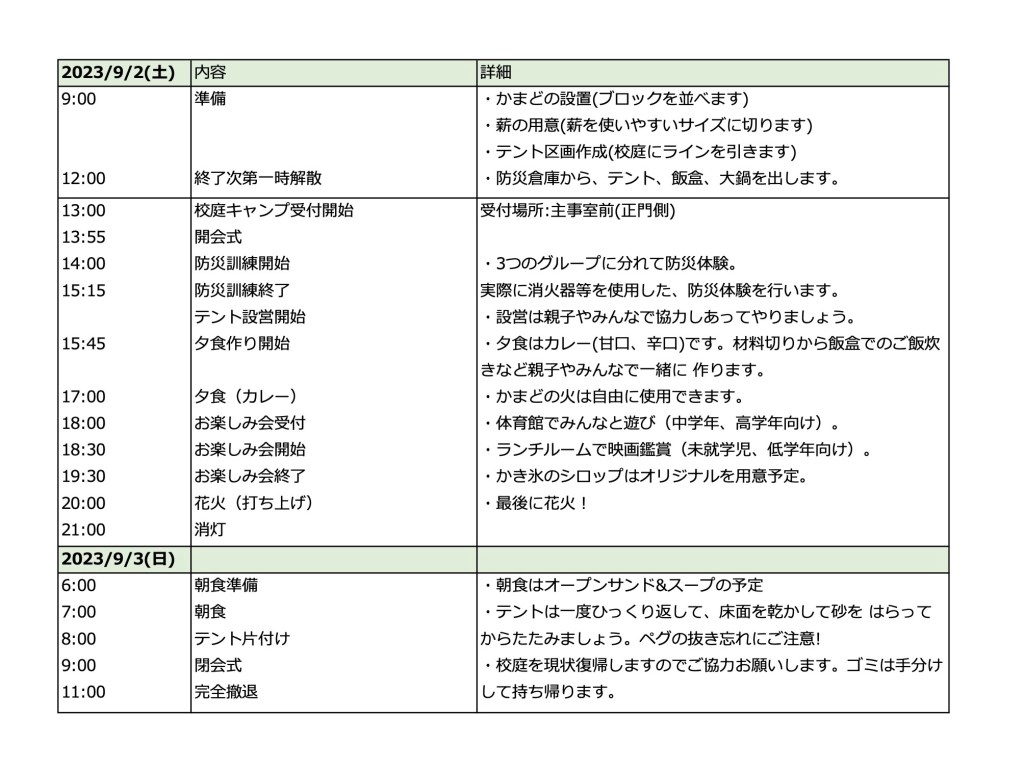 (内容) 防災訓練、テント張り、宿泊、夜のお楽しみ会など