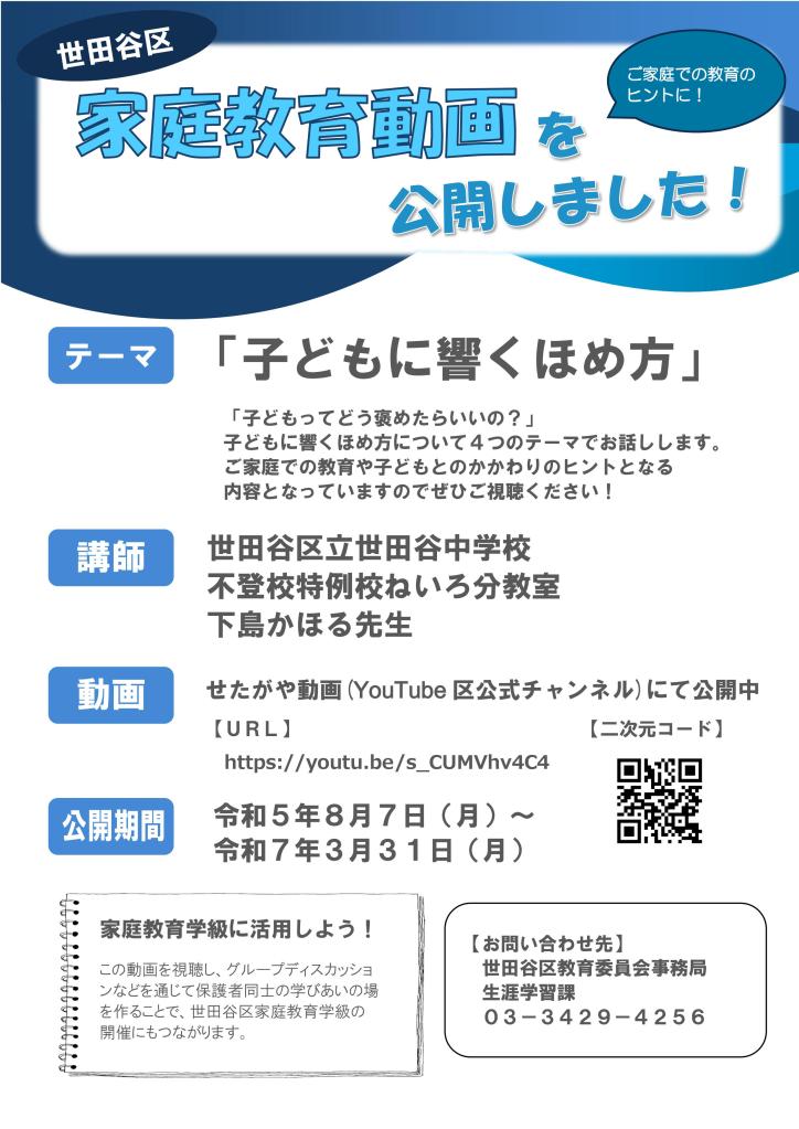 今年度より、世田谷区教育委員会から家庭教育に役立つ情報を動画形式にて発信しております。