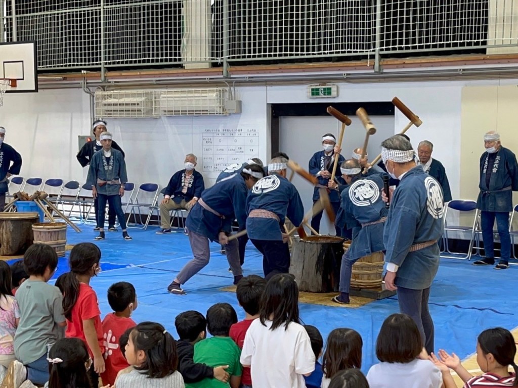 仕上げは、先生方や三土代会の皆様。力強い杵つきの音が響き、子供たちも「よいしょ!よいしょ!」と大盛り上がりです。そして最後は「ありがとうございました」と大きな声で、感謝の気持ちをお伝えしました。