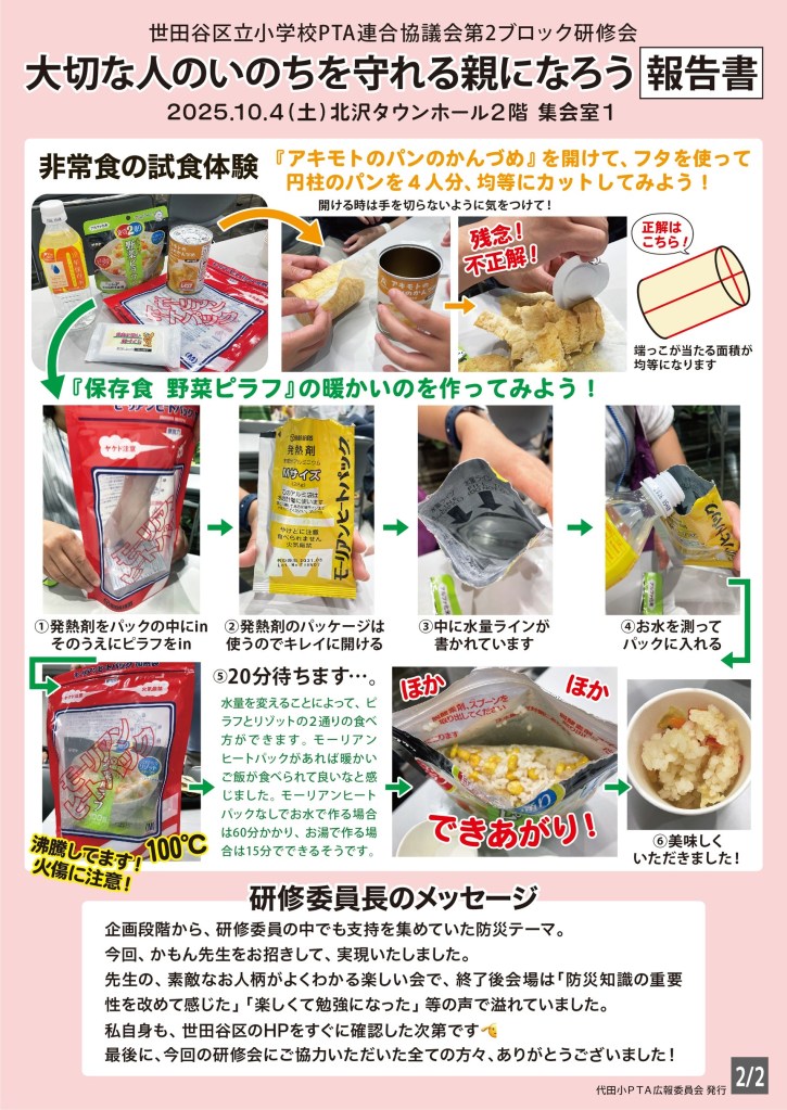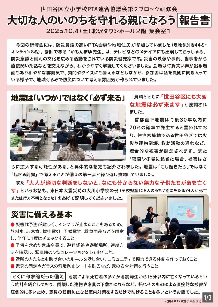研修実行委員会, 全カテゴリー, 広報委員会【研修報告】 2025年10月15日2025年10月15日 daitaptayakuin 10月4日土曜日「大切な人のいのちを守れる親になろう」の研修会が開催されました。 当日は約50名の方が参加し、講師の先生のお話をクイズや質問に答えるなどしながら、和やかな雰囲気で行われました。 今回は広報委員より、研修会の様子をまとめた報告書を作成いたしました。残念ながらご出席頂けなかった方々も、ぜひこちらの報告書をご一読ください! 以上 広報委員会 共有: X で共有 (新しいウィンドウで開きます) X Facebook で共有 (新しいウィンドウで開きます) Facebook いいね 読み込み中…