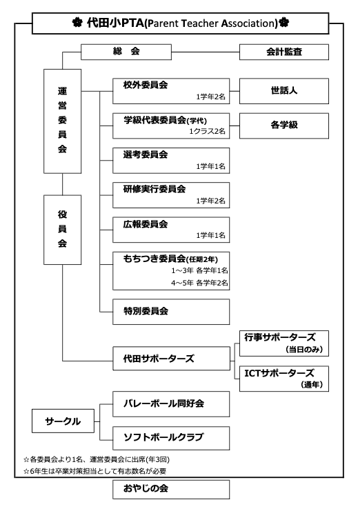 - 代田小PTAで役員と校外委員長を引き受けたことがある会員は、今後永久に役員と委員を引き受けなくてよい。